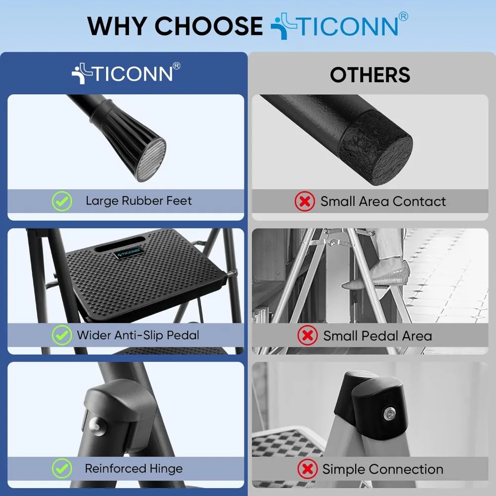 - [STURDY & SAFE] Made with high-quality steel and a durable construction, our step ladder 3 step folding is built to withstand up to 330 lbs of weight. With its anti-slip treads and non-slip rubber feet, you can climb up and down the folding ladder with confidence, knowing that you're safe and secure.