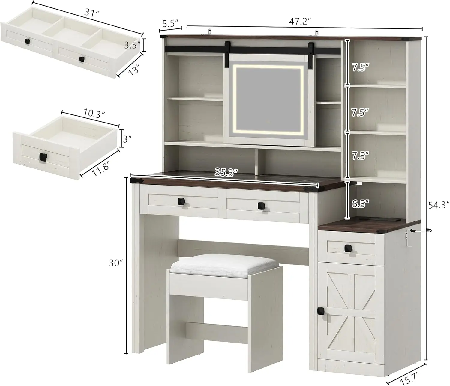 Farmhouse 47" Large Makeup Vanity Desk with Glass Tabletop, White Vanity with Sliding Mirror and Lights, Vanity Set with Stool