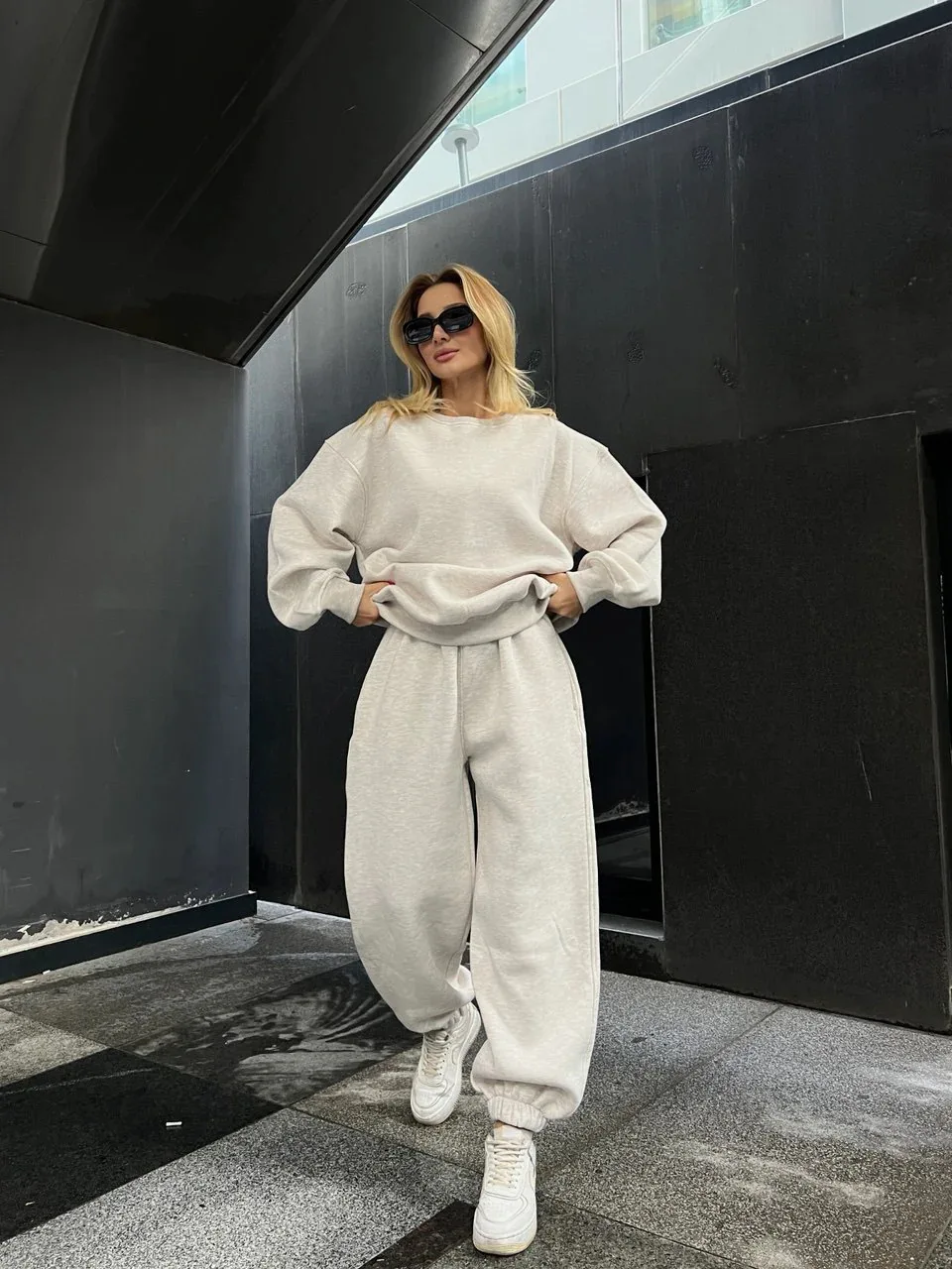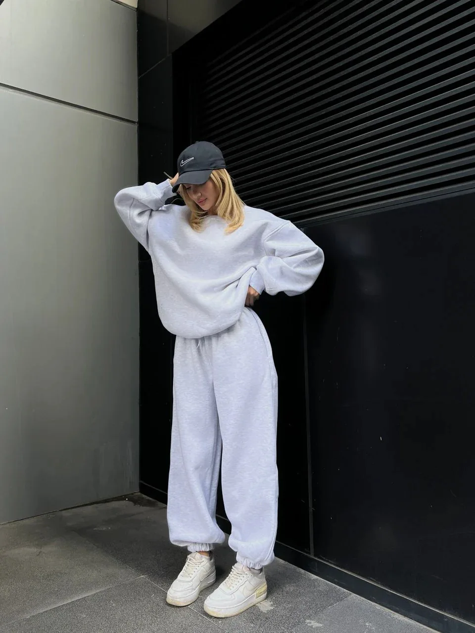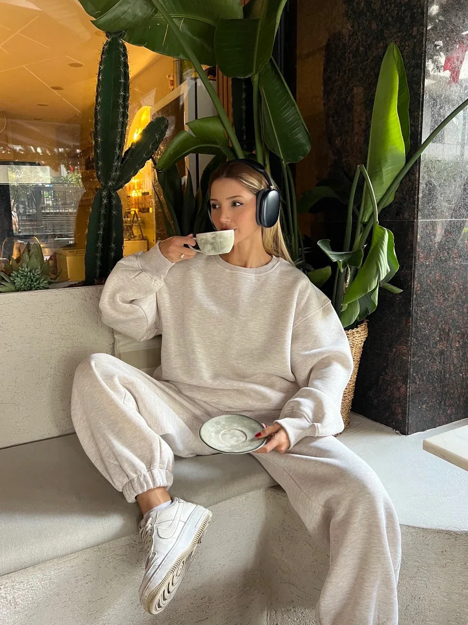This 2025 autumn new women's fashion pure color loose round neck sweatshirt and long pants casual 2-piece set exudes a trendy street style, perfect for fashion-forward individuals.