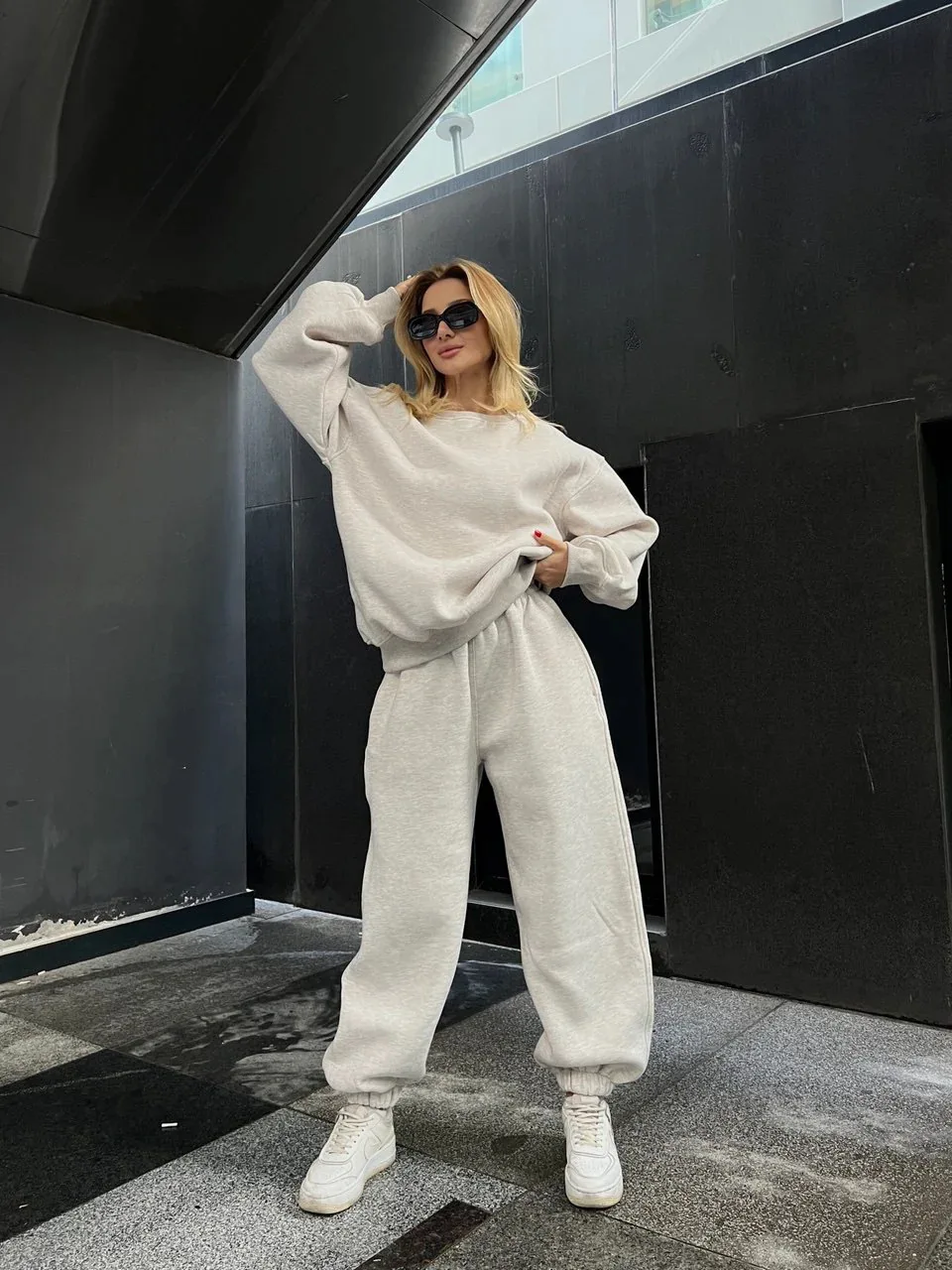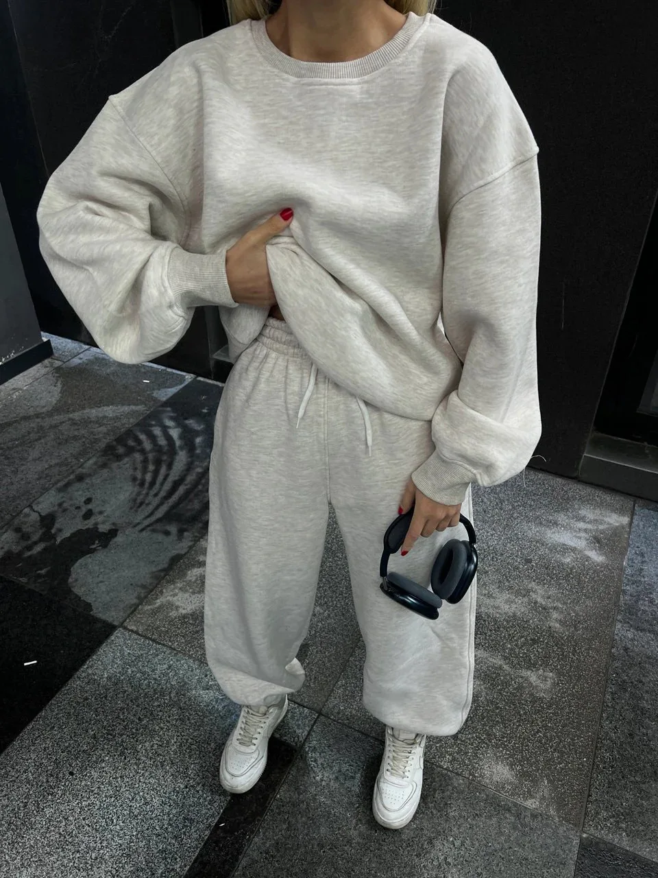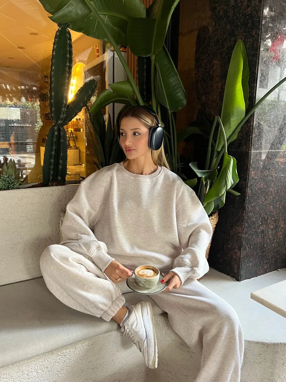 This 2025 autumn new women's fashion pure color loose round neck sweatshirt and long pants casual 2-piece set exudes a trendy street style, perfect for fashion-forward individuals.