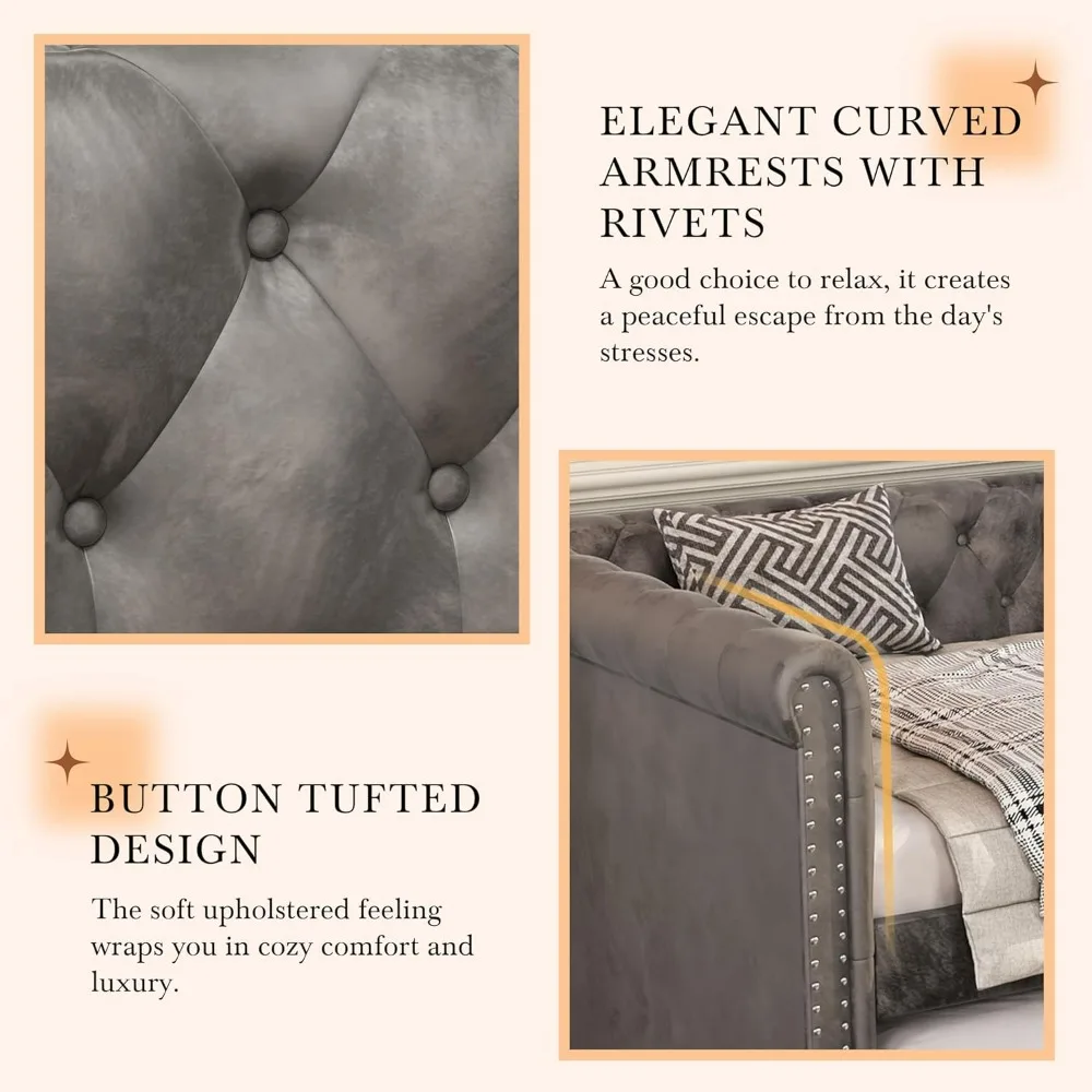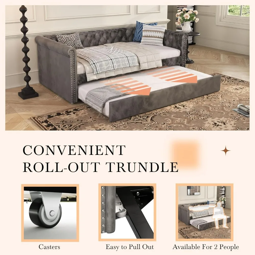 Modern Velvet Daybed with Trundle, Sofa Bed Featuring Tufted Button Design and Curved Armrests for Living Spaces and Bedrooms