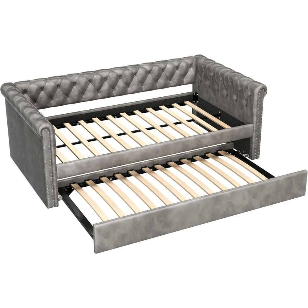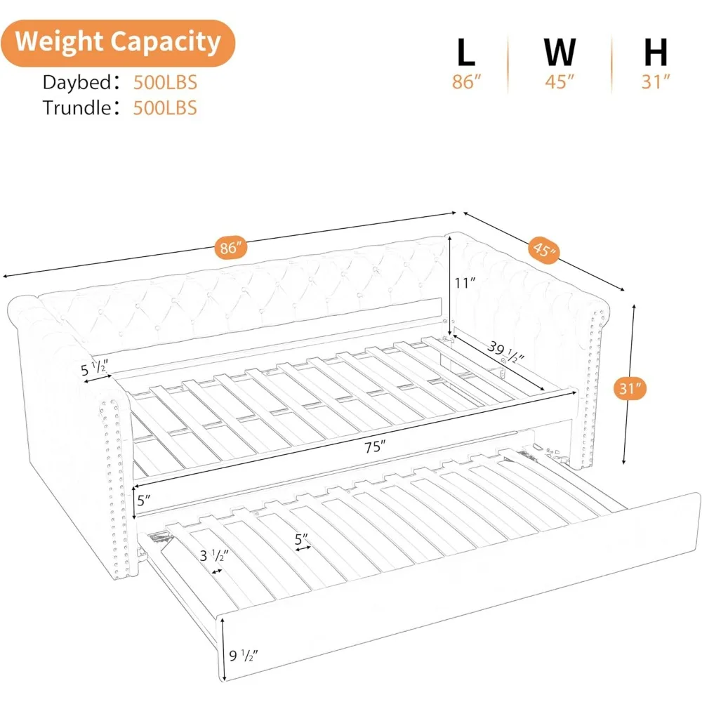 This daybed with trundle is a versatile piece of living room furniture designed to offer both comfortable seating and an additional sleeping space for guests. It features a sturdy plywood frame capable of supporting up to 500lbs, ensuring durability and stability. The trundle mechanism is built to last, providing smooth operation and reliable support over time. Inspired by mid-century design, this daybed boasts a button-tufted armrest, curved arms with nailhead trim, and an edgefold design that combines modern elegance with classic style. It adds a touch of sophistication to any home setting. For a comfortable seating experience, the daybed offers a soft backrest and side armrests that provide ample support and relaxation. The soft velvet fabric not only enhances the elegance but also contributes to a steady and luxurious feel in your living room or bedroom. The daybed has overall dimensions of 86 inches in length, 45 inches in width, and 31 inches in height. It does not include a mattress and requires assembly with the help of an instruction manual. Should you encounter any issues during assembly or have any questions, you can visit our website or contact us via email at csr@merax.com for assistance.