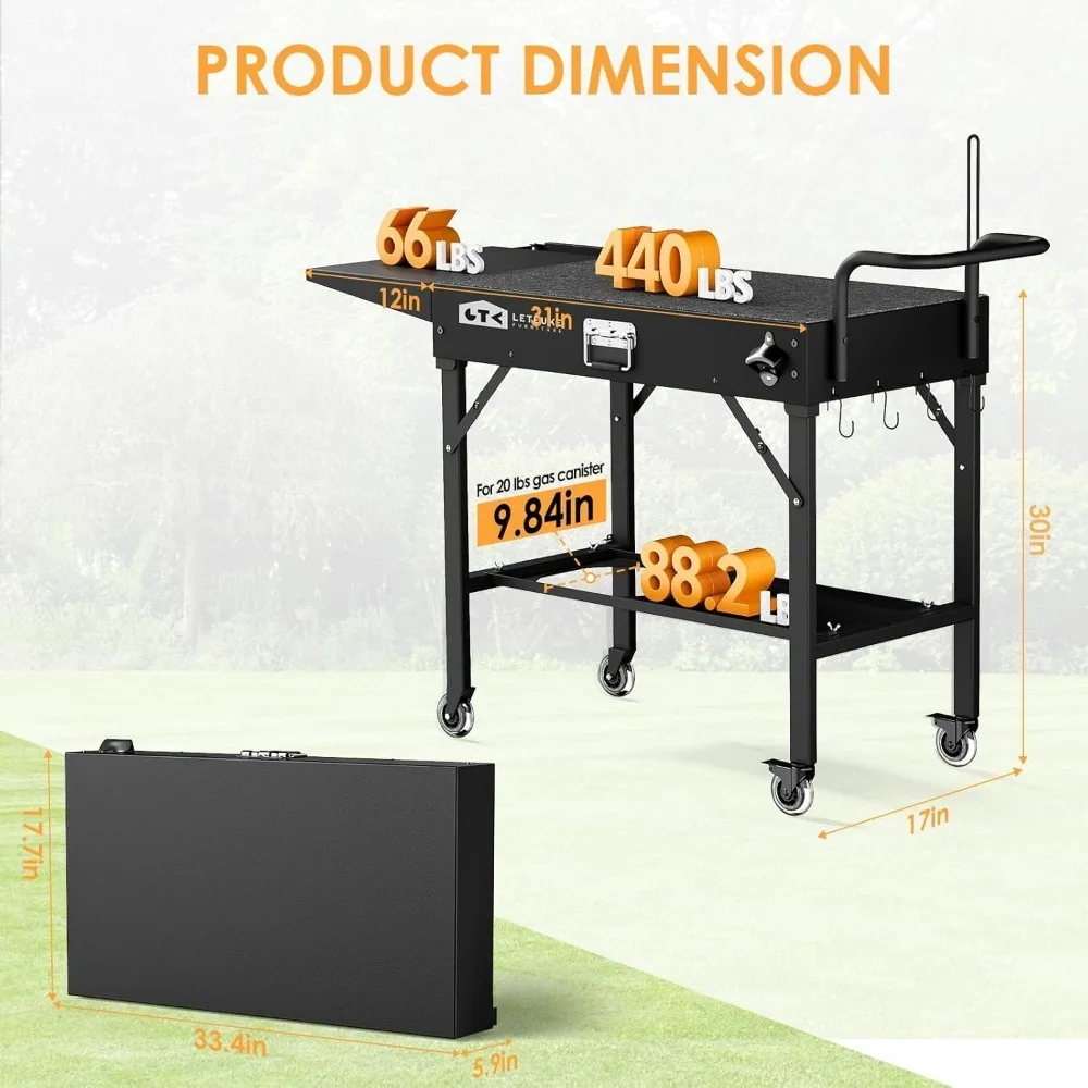 This grill table is a versatile outdoor cooking solution, featuring dimensions of 43 inches in depth, 17 inches in width, and 30 inches in height, and is designed to accommodate grills measuring 31 inches by 17 inches. The carbon steel tabletop offers ample space for a variety of portable outdoor cooking appliances, including Ninja grills, Ooni pizza ovens, tabletop grills, and propane camping stoves. Constructed with a sturdy, welded carbon steel frame, this grill cart can support up to 450 pounds, making it a durable choice for outdoor cooking. It is equipped with flexible wheels and ergonomic handles, ensuring stability and ease of movement, whether you're moving it indoors or outdoors. The grill cart boasts a large storage capacity, with a bottom board capable of holding a 20-pound gas cylinder. It also includes four multi-function hooks, a knife holder, a tissue box, and bottle openers, providing ample space to organize and store your cooking tools, turning it into a mobile outdoor prep station. Assembly is straightforward, with clear instructions provided, and the grill cart requires minimal maintenance, allowing you to spend more time enjoying your BBQ. Should you have any inquiries about the product, feel free to reach out to us for assistance. We hope this grill cart enhances your outdoor cooking experiences.