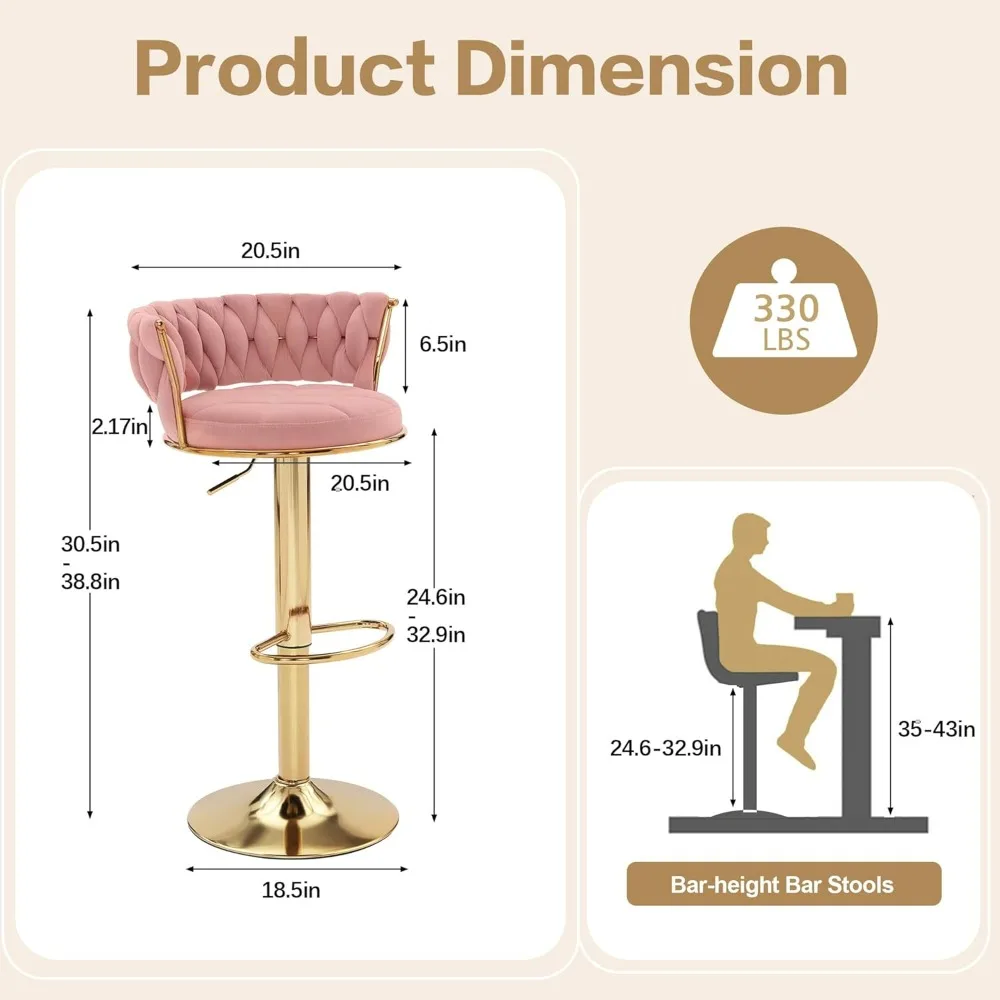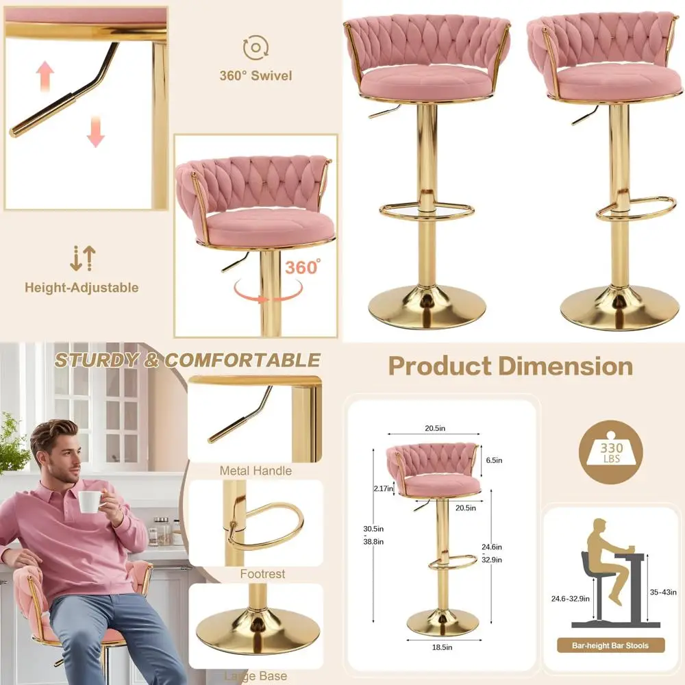 Certainly! Here's a rewritten product description based on the provided information: --- Introducing our Velvet Bar Stools, a modern and stylish addition to any contemporary setting. These bar stools boast a unique weave craftsmanship and a golden base, offering a fusion of comfort, style, and durability. The exquisite velvet fabric is soft, pill-resistant, and combined with high-density sponge filling, ensures a plush touch and unmatched comfort. With a 2.17-inch thick velvet cushion, these stools provide an ideal sitting experience that maintains its shape over time. Featuring a 360° swivel and height adjustable design, these bar chairs can be easily adjusted from 24.6 inches to 32.87 inches using the pneumatic lift handle. This makes them versatile for various settings, whether at a bar, kitchen island, or counter. The swivel function adds to their flexibility, allowing for easy conversation around the room. Our bar stools are built for stability and safety, with a large base providing support and balance. They can hold up to 330lbs and are equipped with non-slip and anti-scratch rubber pads under the base to protect your floor from scratches and reduce noise when swiveling. The larger base also ensures the chair remains stable even when adjusted to its highest position. This multifunctional set of two bar stools is perfect for various uses, including bars, kitchen counters, kitchen islands, modern bar chairs, kitchen stools, farmhouses, restaurants, salons, reception desks, and even as dining stools in dining rooms. They can fit any decor theme, making them a versatile choice for your home or business. --- This description maintains the essence of the original text while rephrasing it to ensure uniqueness.