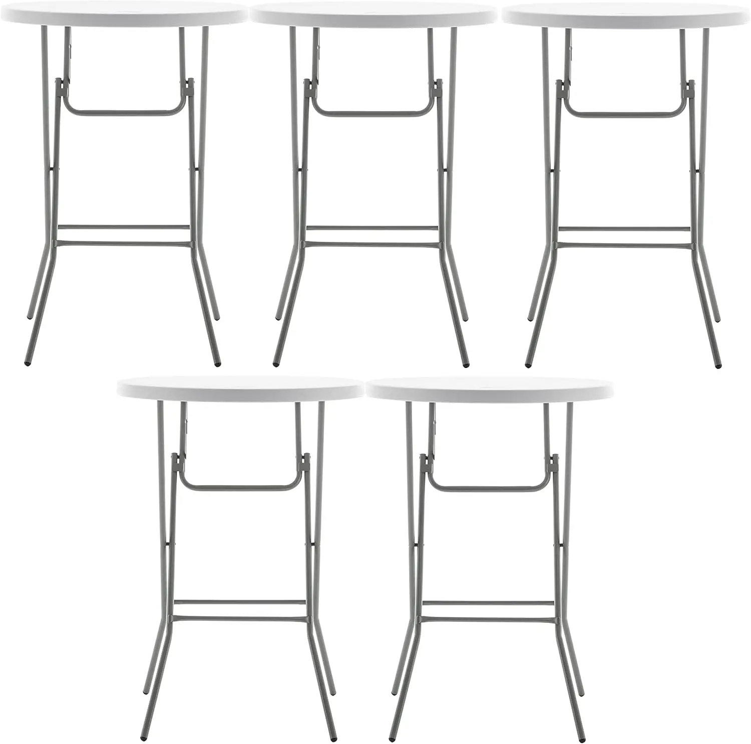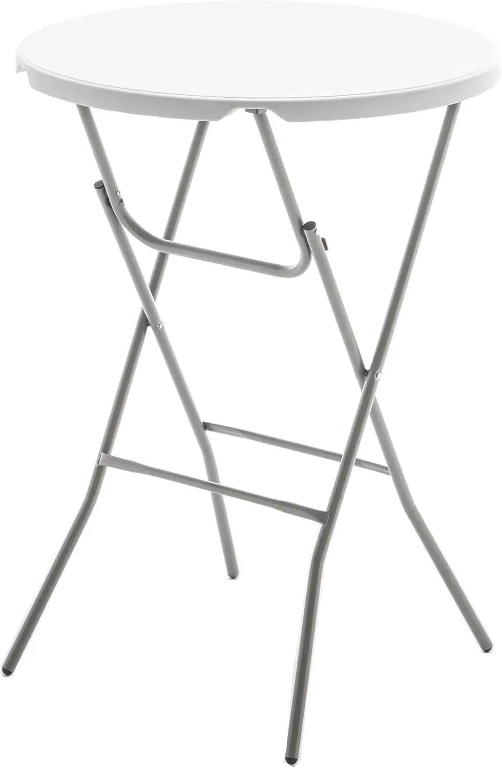 This product is a commercial-grade folding table designed for both indoor and outdoor use. It features a 32-inch round top, making it suitable for various settings such as hotels, parties, and social events. The table is stable enough to support heavy items and is constructed from a durable 45mm thick plastic. It can accommodate 2-4 adults and has a bar height of 43.3 inches, ideal for standing events or as a high-top table. The table boasts sturdy cross legs for enhanced stability and a smooth plastic surface that is easy to clean and maintain. It is resistant to water and stains, and the stretch nylon covers can be used for drinks or floral arrangements, adding an attractive touch to the surroundings. Its sleek design and practical features make it a great fit for offices, classrooms, or conference rooms. Versatile and multipurpose, this table can be used for weddings, banquets, restaurants, and more. It is lightweight and easy to transport, making it perfect for camping, road trips, and other travels. The Granite White color adds a convenient touch to any setting, from classrooms to homes or events. The table is designed for easy opening, folding, storing, and carrying, with a folding mechanism that offers versatility for various occasions. It features dual support braces, a gray powder-coated steel frame with 1.0mm thickness, and a locking legs mechanism for added security. The non-slip plastic feet caps provide stability and protect surfaces from scratches. For compact storage, simply fold the legs and store the table in a closet, under a bed, or any other convenient location. Each foot has a rubber cap that improves traction on slippery surfaces and shields floors from damage. The overall size is 32 inches round and 43.3 inches in height, weighing 15lbs. The folded dimensions are 53 inches by 31.5 inches by 1.6 inches. The table has a dynamic weight capacity of 40lbs and can support static weights of up to 120 lbs. It comes fully assembled and ready for immediate use.