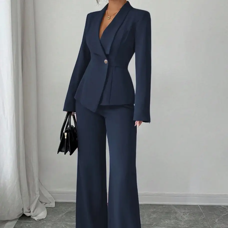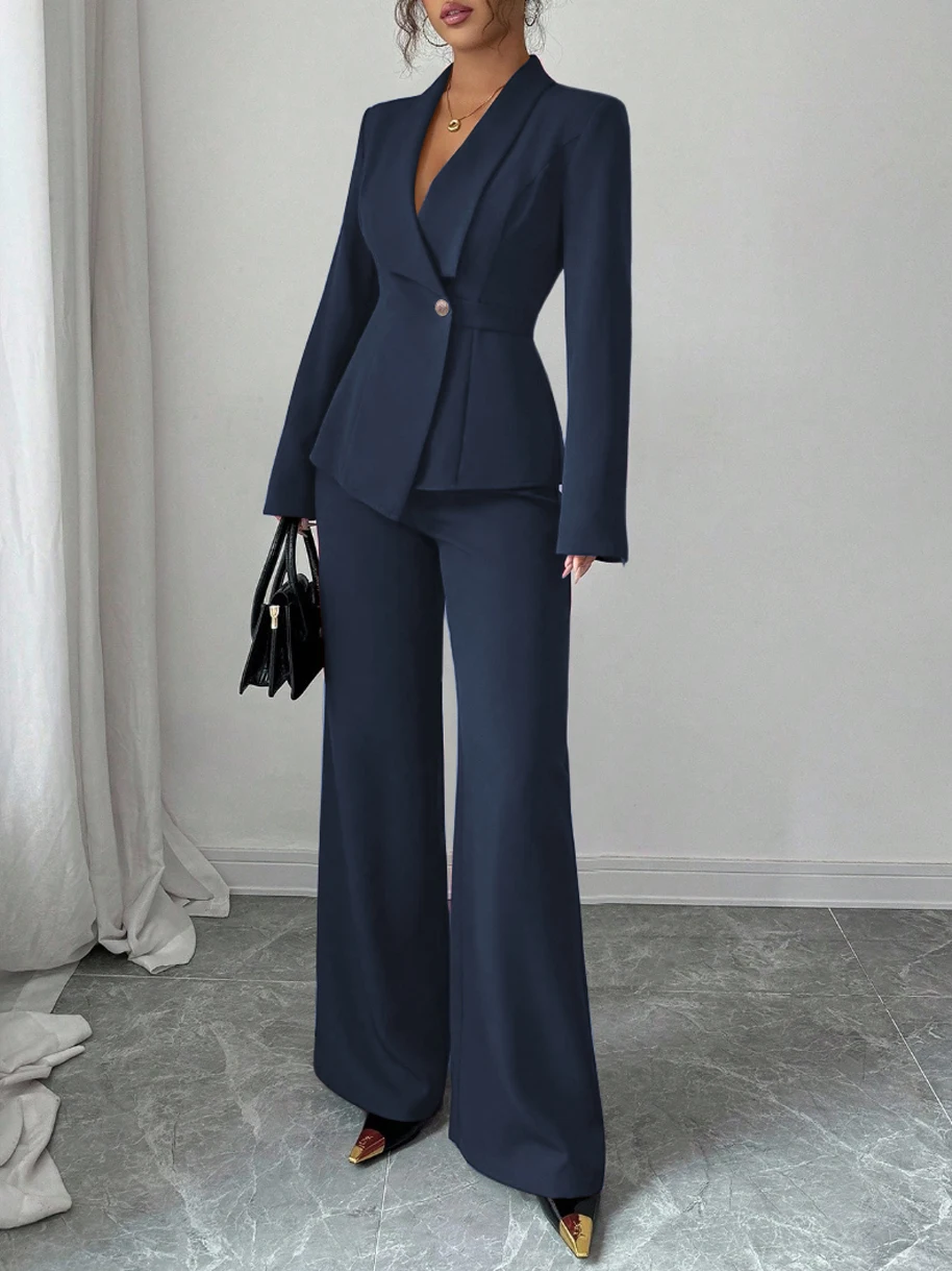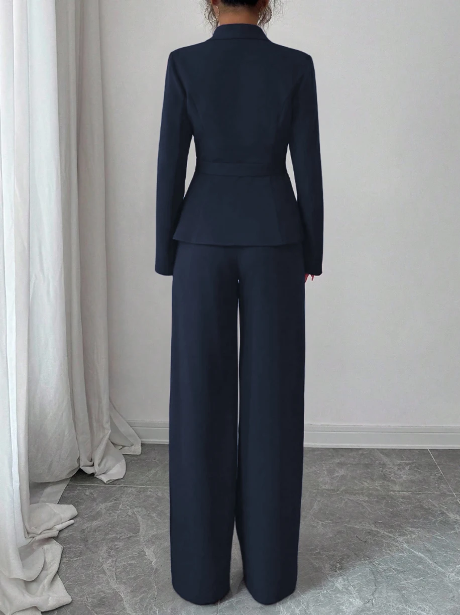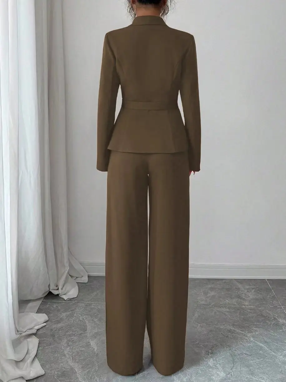 Women's Casual Elegant Solid Color Pocketless Green Collar Long-sleeved Jacket Top and Simple Wide-leg Pants Two-piece Set